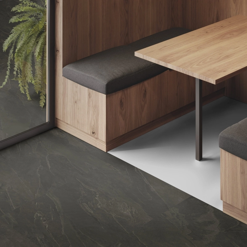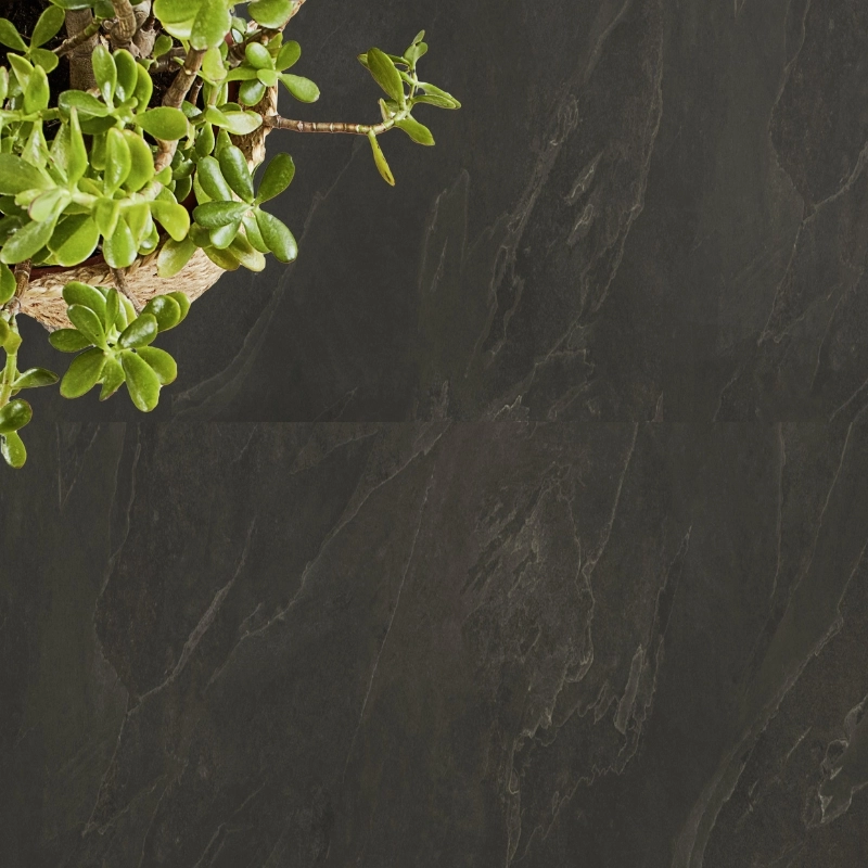 Panele winylowe Tarkett iD Inspiration 30 Naturals Liguria Slate Black 24529067 to dekor inspirowany naturalnym łupkiem z włoskiego regionu Liguria. Głęboka, antracytowa czerń z subtelnymi, nieregularnymi przejściami tonalnymi oddaje autentyczność kamienia, a jednocześnie wprowadza do wnętrza klasę i nowoczesny styl. To doskonała propozycja do wnętrz, które mają wywoływać wrażenie elegancji, siły i harmonii.