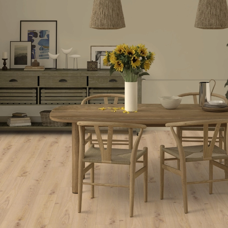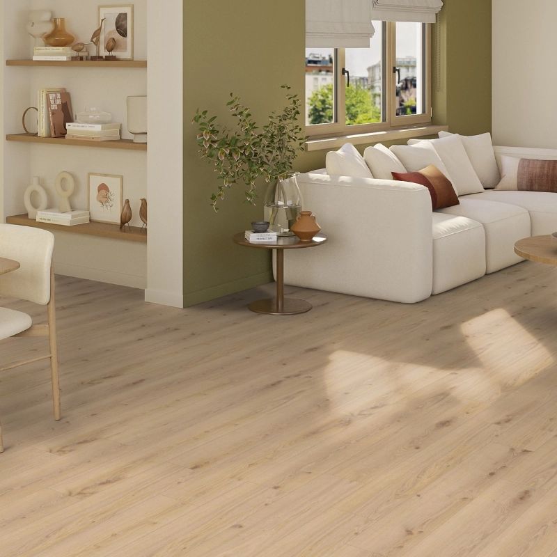 Wzór Delicate Oak Almond powstał w technologii EIR (Embossed in Register), która precyzyjnie odwzorowuje strukturę drewna. Każdy słój jest nie tylko widoczny, ale i wyczuwalny pod palcami – dzięki czemu panele prezentują się jak prawdziwa drewniana podłoga, przy zachowaniu maksymalnej odporności i łatwości pielęgnacji.