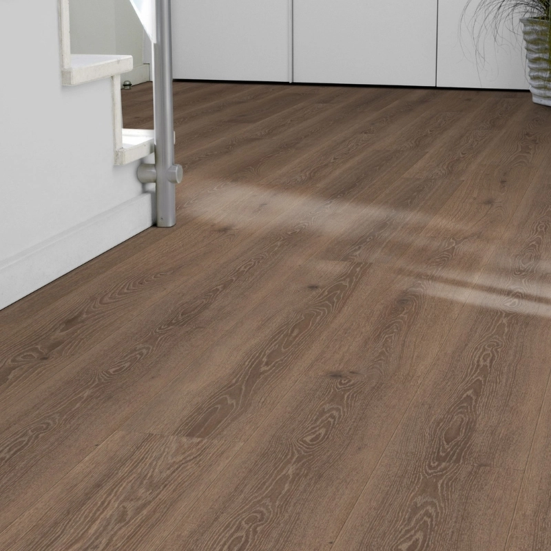 Panele winylowe Tarkett iD Inspiration 55 Authentics Highland Oak Arabica 24513088 to połączenie ciemnej, szlachetnej tonacji drewna z perfekcyjnym odwzorowaniem jego naturalnej struktury. Dzięki technologii EIR (Embossed in Register), tłoczenie idealnie pokrywa się z rysunkiem drewna, tworząc realistyczny efekt zarówno dla oka, jak i dotyku.