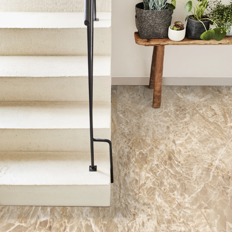 Kolor Emperador Beige dobrze współgra z ciepłymi drewnami, beżami, odcieniami piasku i naturalnymi tekstyliami — tworząc spójną i przytulną kompozycję. W kontrastach z ciemnymi meblami dekor nabiera wyrazu, a w jasnych aranżacjach staje się delikatnym tłem.