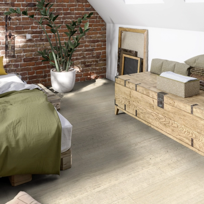 Tarkett Id Inspiration High Traffic 70 Naturals Travertin Grande Sand 24506082 to dekor, który łączy klasyczny wygląd trawertynu z wytrzymałością serii High Traffic 70. Jego jasny, piaskowy kolor idealnie wtapia się w przestrzeń, tworząc spokojne, naturalne tło dla mebli i dodatków.